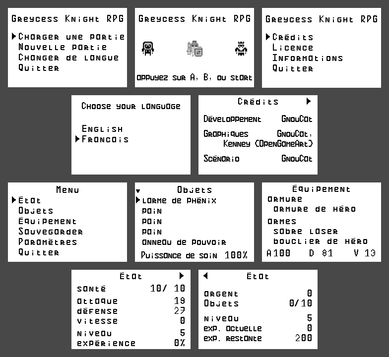 Greycess Knight RPG consiste pour l'essentiel en un jeu de rôle en tour par tour. Entre les combats et pour l'histoire, on se meut sur une carte et on a accès à un menu pour divers trucs (voir l'état de son personnage, changer son équipement, sauvegarder, changer des paramètes, etc.).